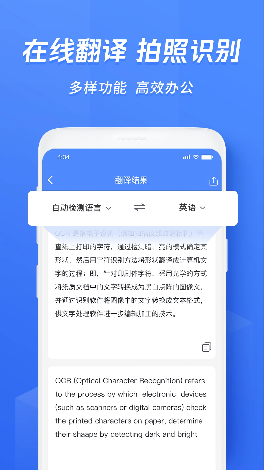 2.节省时间:没有必要翻译或手工输入文件,可以直接将图片中的文字识别出来,节省您的时间。