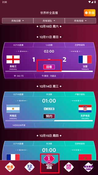 3、点击回看,你可以观看错过的世界杯赛程直播;