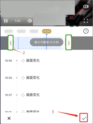 查看云回放时,点击回放画面右侧的“摄影机”图标进行录制,在时间刻度条中,可以选择需要下载的录像。点击右下角确认下载即可。下载完成后,保存至App“相册”/手机相册。
