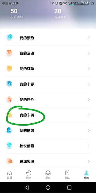 1、打开并登录奇瑞汽车app,进入“我的”页面,下滑屏幕至“我的车辆”处(下图绿色圈圈区域)并点击