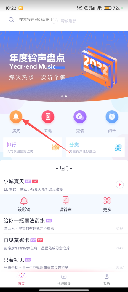 1、首先,打开【酷音铃声】这款软件。进入软件首页后,找到并点击【搞笑】分类,随即就会进入搞笑铃声专区,接下来就可以尽情挑选自己喜爱的铃声啦。