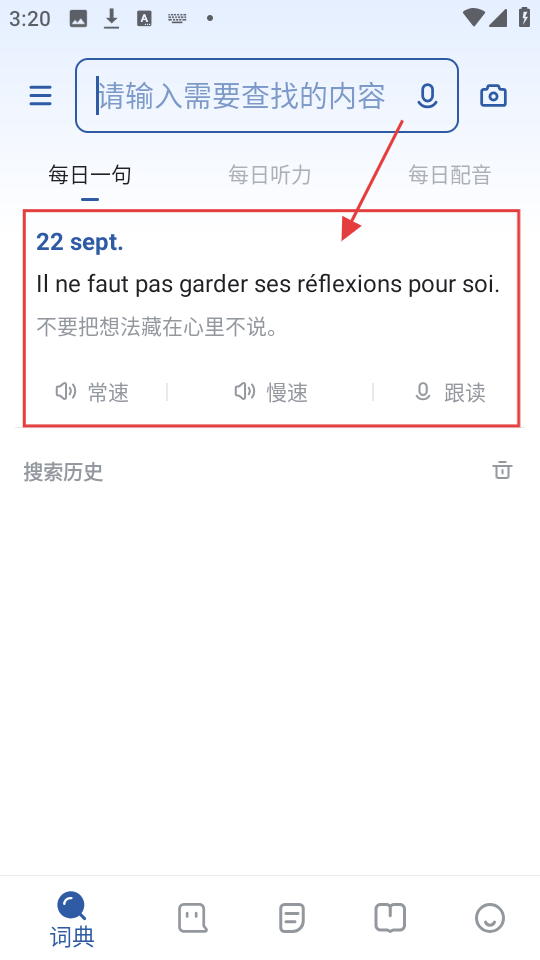 在应用界面中,用户能够查看【每日一句】板块里的法语句子及其对应的中文翻译,同时还能使用【常速】【慢速】【跟读】等功能。