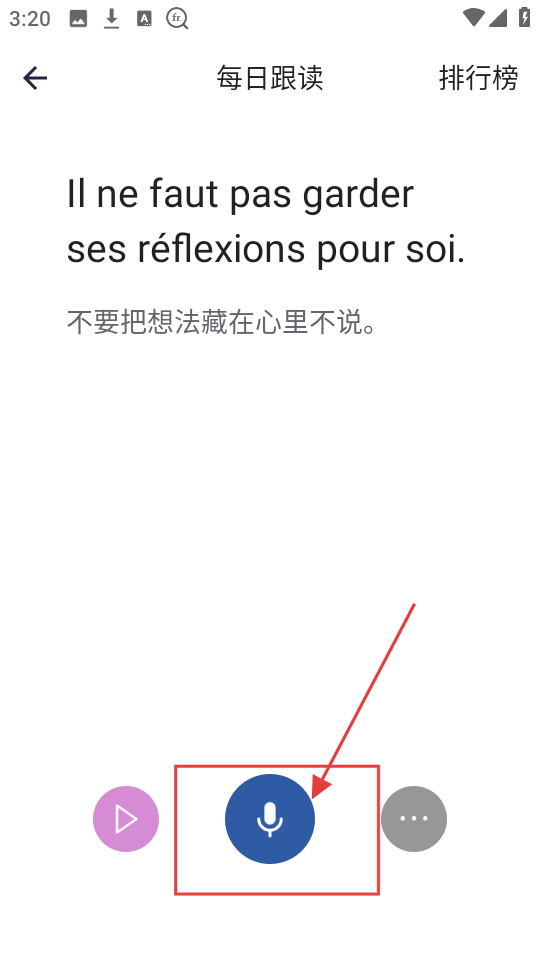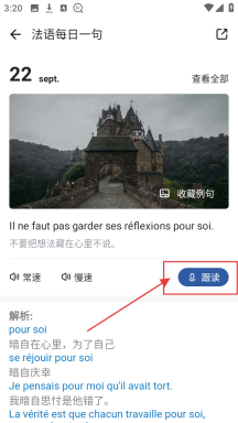 2、进入【法语每日一句】的详情页面后,会呈现出句子、配图等内容,点击【跟读】按钮,就能进入跟读界面进行发音练习。