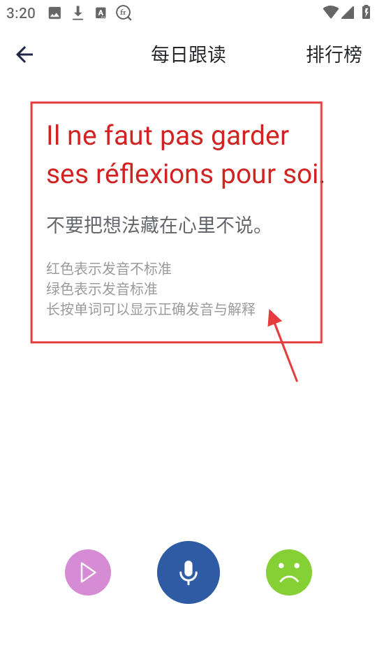 3、在每日跟读界面,点击麦克风图标,可进行语音跟读,系统会对发音进行评估。