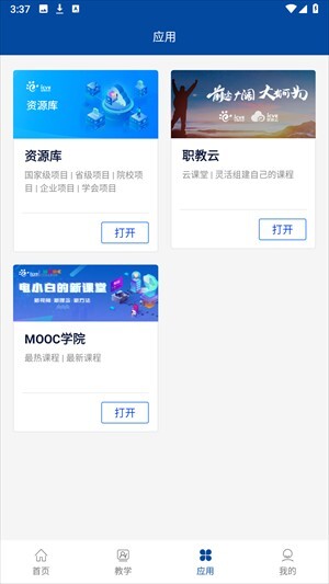 2、应用界面呈现出三大类别,分别是资源库、职教云与mooc学院。