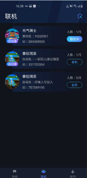 4、加入房间或自行创建房间后,可在【联机】页面查看已有的房间。点击进入房间详情,再点击【联机】按钮,即可成功与房间内成员联机。
