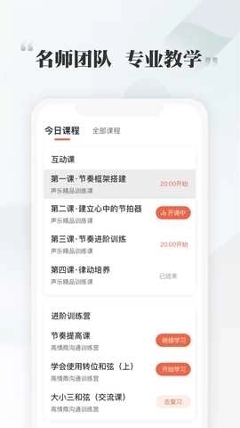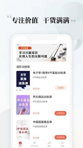 打开APP或访问官网,首页按"书法绘画""音乐舞蹈""健康养生""生活美学"四大品类展示课程。支持按难度(入门/进阶/大师)、时长(单次课/系列课/年度课)、价格(免费/付费)筛选。每门课程含试听片段、讲师介绍、课程大纲、学员评价,帮助决策。