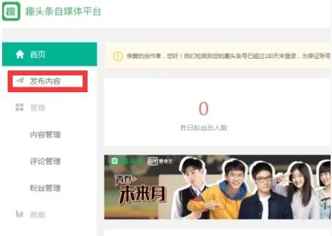 1、我们先打开软件,注册并登录好趣头条极速版账号,进入趣头条极速版主页后,再点击左侧菜单栏里的【发布内容】选项。