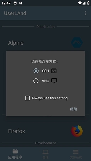 首次启动userland时,它会列出常用发行版和linux应用程序。