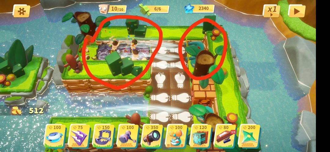 如图,这地图太适合地鼠锤了,四个锤子加上捕兽夹,控制绝对拉满。这里必须提醒一下,相对的两个锤子最好调一下自动攻击模式,把两个捶地的时间错开,千万不要让它们同时攻击。