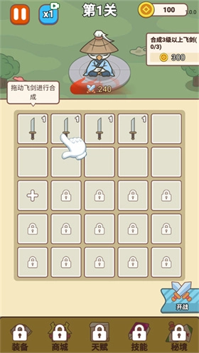 1、在游戏内,玩家可以通过移动飞剑进行合成,飞剑的合成只能在准备开始阶段进行。通过将两个相同的飞剑放在一起,可以合成更高等级的飞剑,从而提高其等级和威力。击败敌人可以获得金币,完成任务也能获得金币,这些金币可以用来解锁低等级的剑。