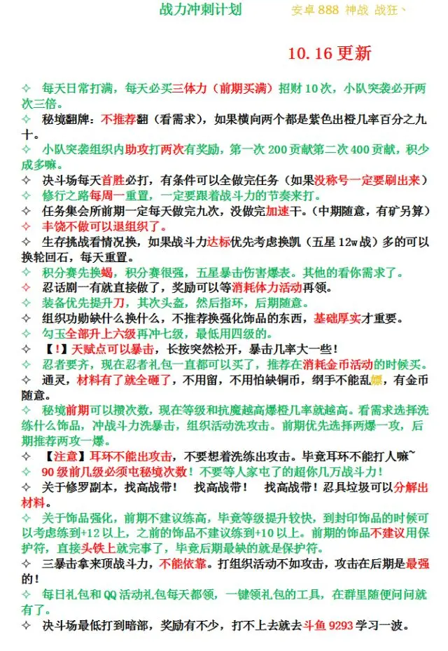 这个是由安卓的一位大佬亲手编辑的,很有意义,对于新手而言很重要,前期战力如何冲,都说到了,很详细