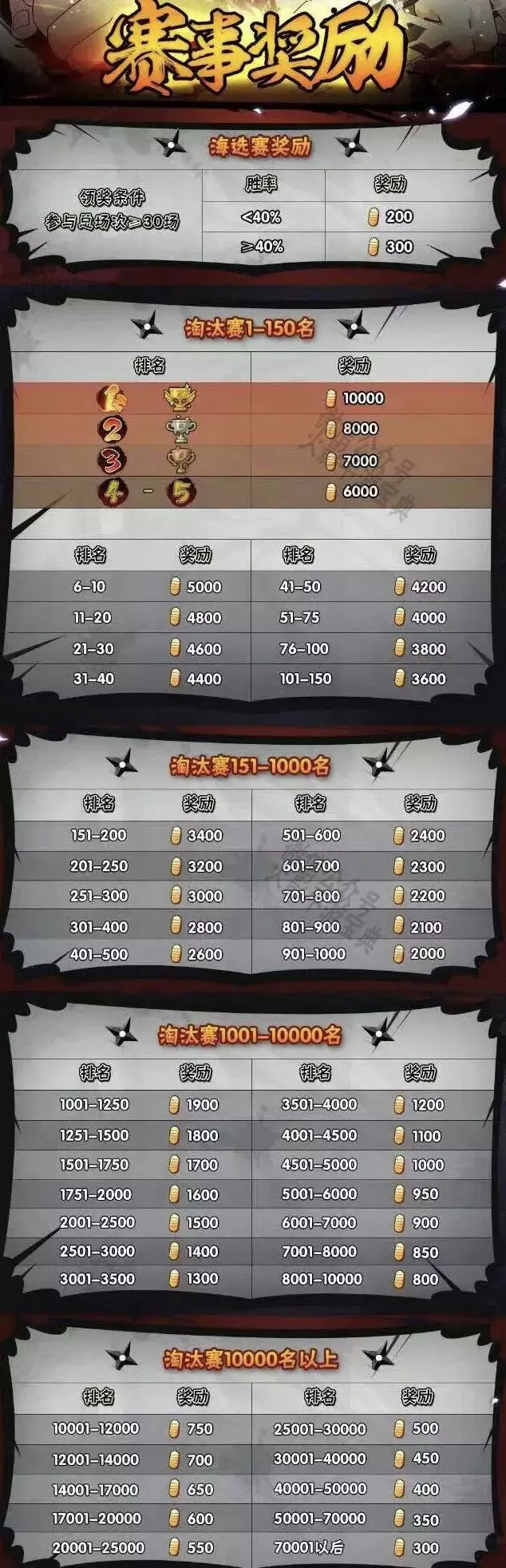 传说的忍者 章 奖励:24w铜币;24w铜币+2普招券;300金币+100体力