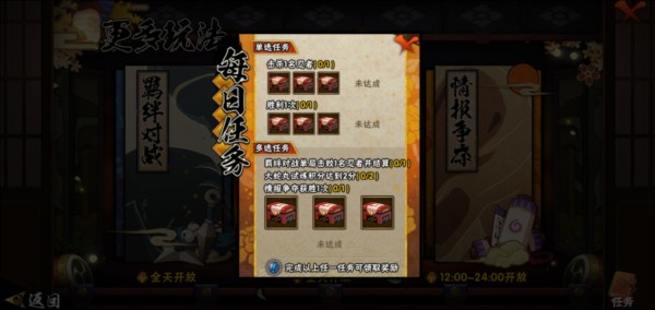 决斗场周边还有多种火影忍者玩法。这里推荐(个人战、锦标赛、不公平之战、大蛇丸实验室、组队战,组队战建议和组织成员一同参与,因为匹配到的人有时极其不靠谱,会出现挂机、直接退游戏的情况),这些玩法每三天进行一次,完成上述玩法对应的任务,宝箱能够开出金币、稀有碎片、勾玉等材料。