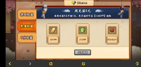 我想强调的是 充值权益 这一块,每次充值满6元,我可以领取100金币+200声望