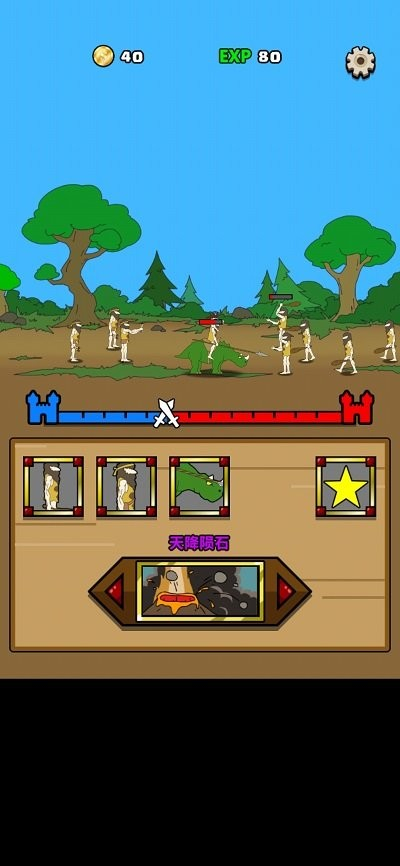 4、进入战斗界面,我们可以点击下方的战士让他们加入战斗,不同的战士需要相应的金币,上面的蓝色方为我们的进度条,先到达并且击败对方基地的为获胜方,