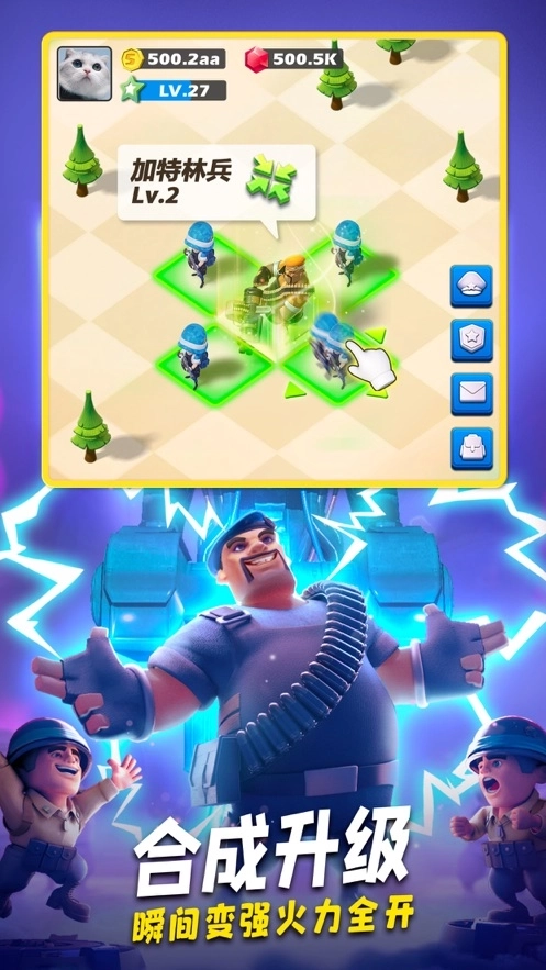 两个相同等级兵种拖拽重叠→立即合成+1阶单位,最高T9