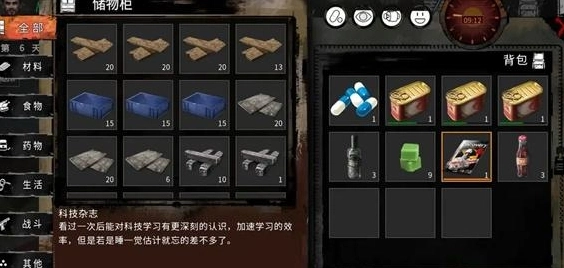 3、过程中饿了就去超市,把一环的超市搬空后,就能刷新出二环的超市和住户;住户里的小胖子会建议先只做4次生食交易,等小胖子完成这4次交易后,会触发一个要掌机的任务,而掌机就在二环超市的二楼。要是困了可以吃蓝色药丸,但蓝色药丸补充精力的速度赶不上精力下降的速度,最后还是得睡觉,这时候就存上两天的药丸,为下一轮循环做准备。准备阶段可以去外面搜刮物资,回家后批量制作夹板绷带,当作下一次循环的启动资金。墙的耐久没了的话,升级墙就能让耐久恢复满;武器不够用就先学匕首再学砍刀,先用砍刀过渡一下。做好音响之后,接着做滤水器、小储水桶、大棚,然后升级大棚。升级到三级大棚需要依次学习制造、金属、机械、制造台、3级灶台、专业化学和高级建筑这些技能。