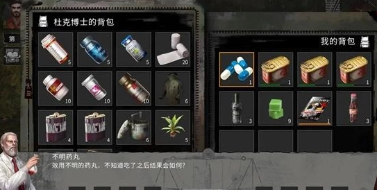 博士这里优先换止疼片、草药、酒,物资充足可以把木布铁也换了。如果没刷出草药,可以返回主菜单再返回游戏找博士,直到刷出草药。