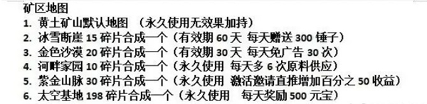 ②、解锁冰雪断崖、金色沙漠、河畔家园、紫金山脉、太空基地中任意一个矿区;