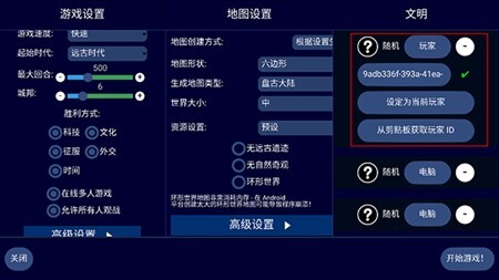 3、与此同时,把每个参与的玩家ID填写到其想要扮演的文明对应的“ID”文本框中,若直接点击“设置为当前玩家”,系统便会自动填入自己的玩家ID。