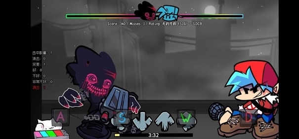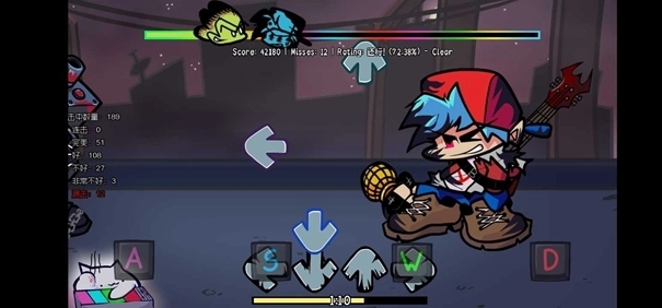 核心节奏对战:玩法继承FNF基础,当音符从屏幕上方到达判定线时,需按下对应的方向键(左、下、上、右)进行演唱,维持血量并击败对手。