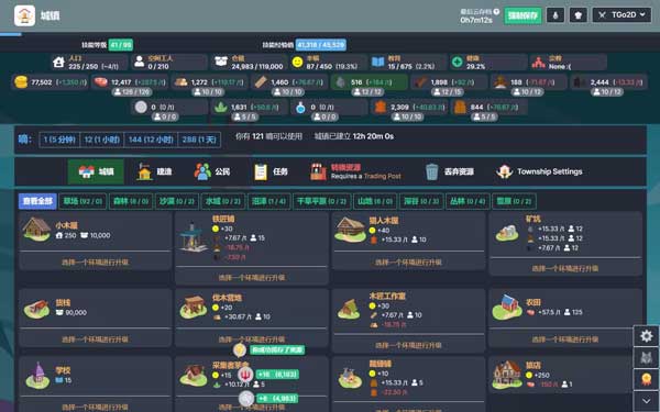 别的话不多说,这里单独要聊的是那个“嘀”——也就是tick的奇怪翻译。城镇的时间不会自动流逝,得消耗tick来手动操作;所有资源项都会在储量后面标注每tick的增量,消耗tick后资源就会相应增减。需要特别注意你的仓储:要是仓储堆满了还消耗tick,资源就会浪费,所以得及时扩大仓储,或者消耗、丢弃多余的资源。tick会随着现实时间每过一段时间自动获得,获取速度和你城镇的发展水平是正相关的。